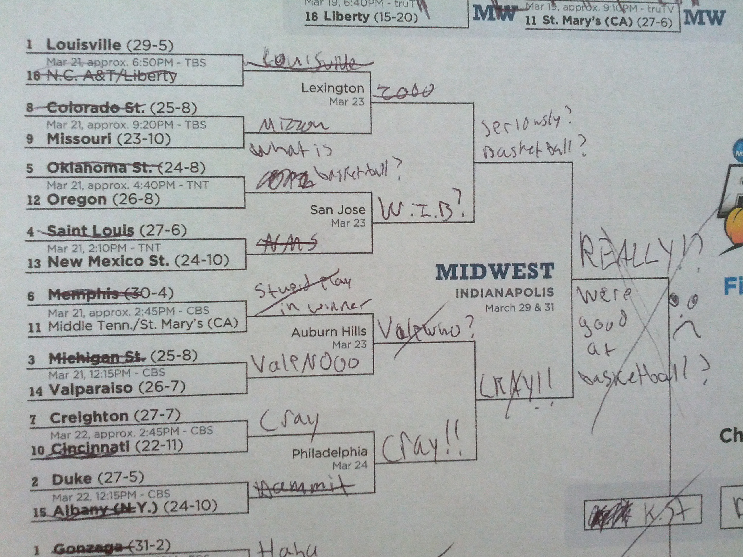 After all the basketball I’ve watched and all the numbers I’ve crunched, I still can’t quite make a decision on who to pick as my National Champion. Having watched the copious amounts of college basketball I’ve watched this season, my gut tells me that Indiana is the best basketball team in the country. The statistical analysis from “The Bracket Machine” seems to believe that Louisville is the team to beat. Either way, I really hope these two teams meet in Atlanta on Monday, April 8th (assuming, of course, that my alma mater falls short of the championship), because that would be one hell of a matchup for a chance to hold up the trophy.