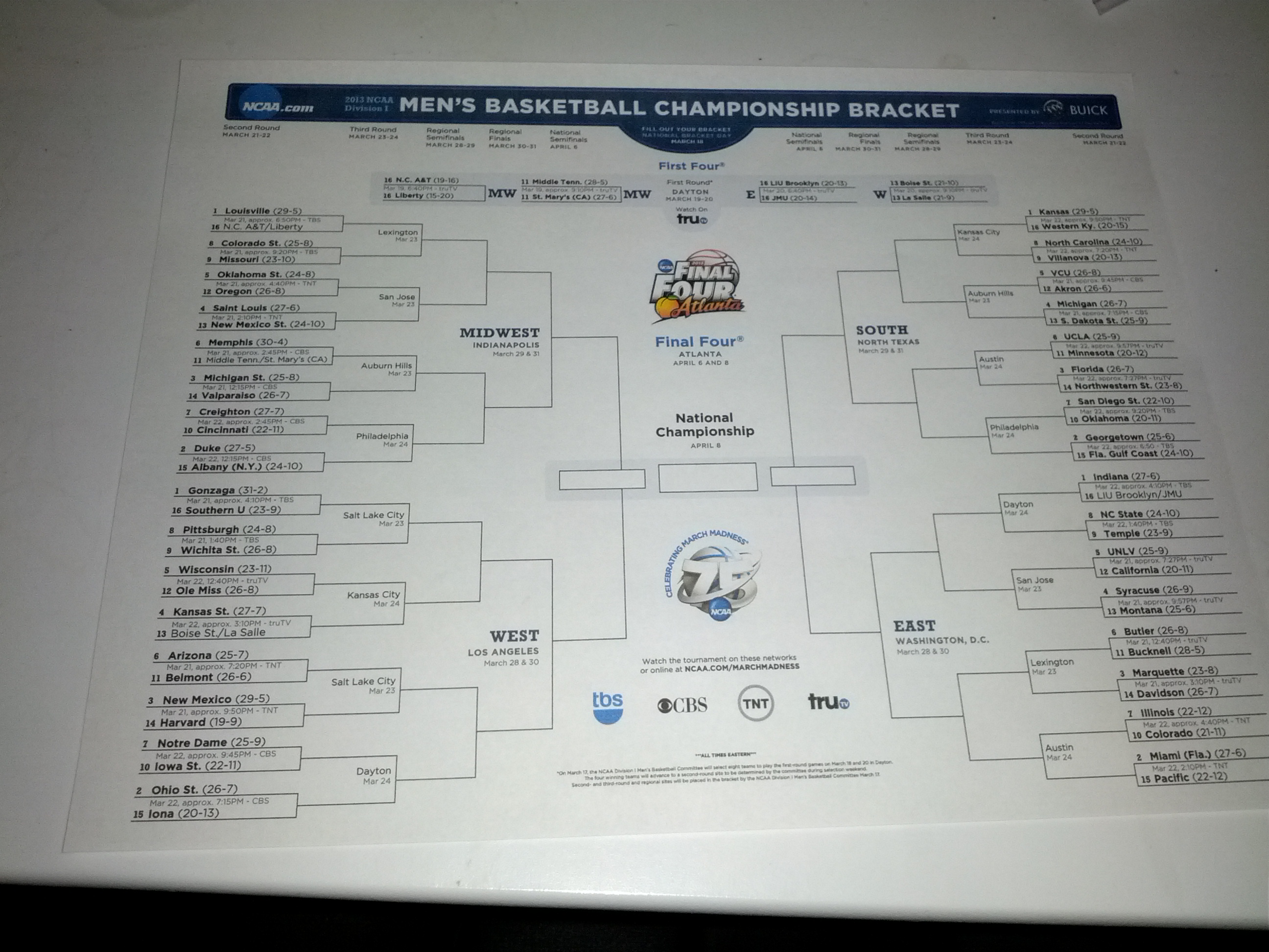 Fast forward ahead to 2012, and it had been 4 straight years of INCORRECTLY picking the National Champion after 6 straight years of glory. The essentially all-professional college team led by John Calipari out of Lexington was a virtual lock to win it all last year, and both my basketball knowledge and statistical analysis (which has been nicknamed “The Bracket Machine”) confirmed this. Thus, I was able to get back on the horse last year and correctly pick the NCAA Tournament Champion. However, I don’t want that streak to last a mere year, so I need to break down this year’s field and see who has the best chance to cut down the nets. Herein lies the problem; with so much more parity in college basketball this year than in past years, it is going to be very difficult to accurately pick the champion. My basketball knowledge favors one team, while “The Bracket Machine” is telling me something else. Thus, I’m going to fill out two brackets this year – one with picks from the gut, the other with picks from a statistical analysis machine.