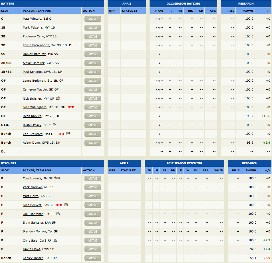 Here’s my final notes for the draft: 1. Carl Crawford is out 2 weeks recovering from wrist surgery. I had no idea. I hate myself (I picked him 74th). 2. Kenley Jansen is only owned in 55% of ESPN fantasy leagues! Come on people, this is Kenley Jansen! 3. I’m sticking with the name “Miguel Cabreras,” hoping this will trick our league commissioner into moving him onto my roster. 4. Adam Dunn is my secret to success this year (I’m only 95% kidding about that).